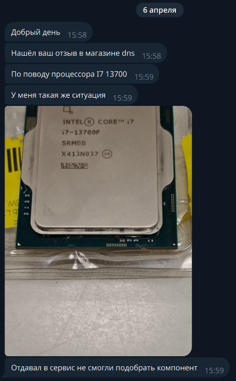 Сначала как обычно подумал, что опять спам, службы безопасности и вот это всё, но нет. Мне написал Роман, который имел неосторожность купить в DNS точно такой же процессор Intel Core i7-13700F, который покупал и я.