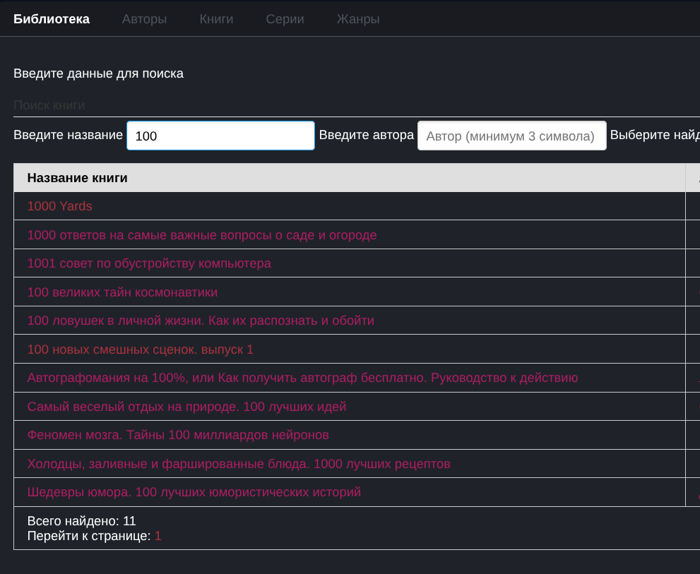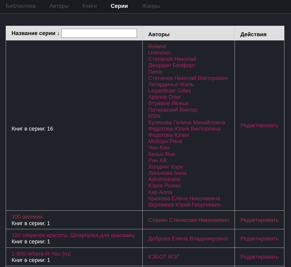 В итоге у меня уже готов просмотр книг, авторов, серий, жанров. Редактирование книг и авторов. Серии в процессе. Жанры потом. Сканер книг тоже требует доработки, которые уже дописаны, но это работа с базой предыдущего прогона, поэтому есть серия с пустым названием. Поэтому в неё попадает куча книг. А ещё поскольку книги готовят разные криворуки люди, есть авторы, у которых в отчестве ещё десяток авторов :)